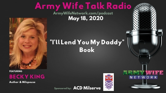 Thank you for listening to another amazing episode on Army Wife Talk Radio. This week we have Becky King joining us to talk about her children’s book titled ‘I’ll Lend You My Daddy’.  This book is a heartwarming story of love, courage, and comfort during deployment for military families with the Army, Navy, Air Force, and Marines. In ‘I’ll Lend You My Daddy’, young boys and girls find ways to manage feelings about deployment (from goodbyes, to the first night, to missed birthdays) as they eagerly await their parents’ return. Through the support of family and friends, care packages and calls, these children grow strong with the knowledge of what it means to serve, generating pride from within, that makes glorious reunions all the more sweet by book’s end.
